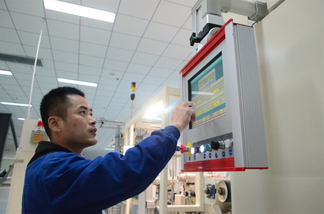 圖為李磊在工作崗位操作全自動(dòng)進(jìn)口設(shè)備的情形。