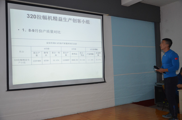 10月11日,公司家紡車間在職工大學(xué)大教室舉行了9月份精益生產(chǎn)總結(jié)會,對車間9月份的精益生產(chǎn)運行情況進行總結(jié),并對相關(guān)問題進行剖析。各主要精益生產(chǎn)承包小組對自身的成績以及不足進行總結(jié),并制定了后續(xù)改進計劃和提升目標(biāo)。會議由車間技術(shù)主管鄭凱主持,車間主任王旭洲進行了全面總結(jié)并對持續(xù)深化精益生產(chǎn)工作提出了新要求。