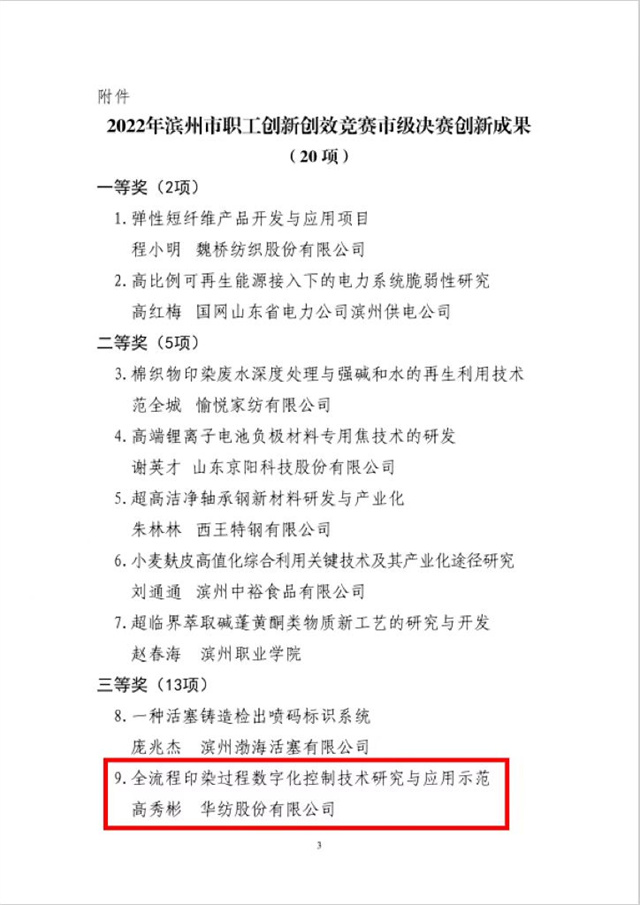 近日,濱州市總工會下發(fā)了《關(guān)于公布2022年濱州市職工創(chuàng)新創(chuàng)效競賽市級決賽創(chuàng)新成果名單的通知》。公司由信息互聯(lián)部軟件開發(fā)組主管高秀彬組織開發(fā)的“全流程印染過程數(shù)字化控制技術(shù)研究與應(yīng)用示范”項目榮獲三等獎。